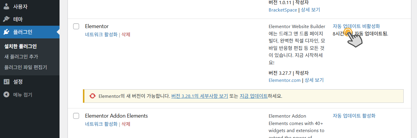 만약 당분간 엘리멘터 버전을 이전 버전으로 되돌려서 실행해야 한다면 자동 업데이트를 비활성화해야 자동으로 업데이트가 안 됩니다.