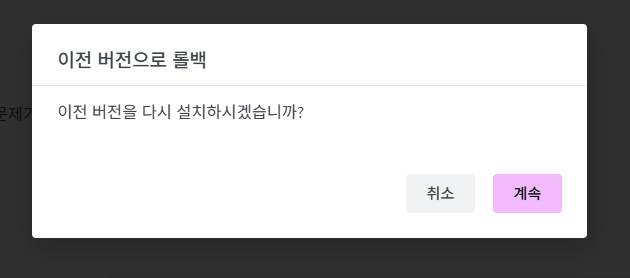 이전 버전으로 롤백 팝업이 표시됩니다.