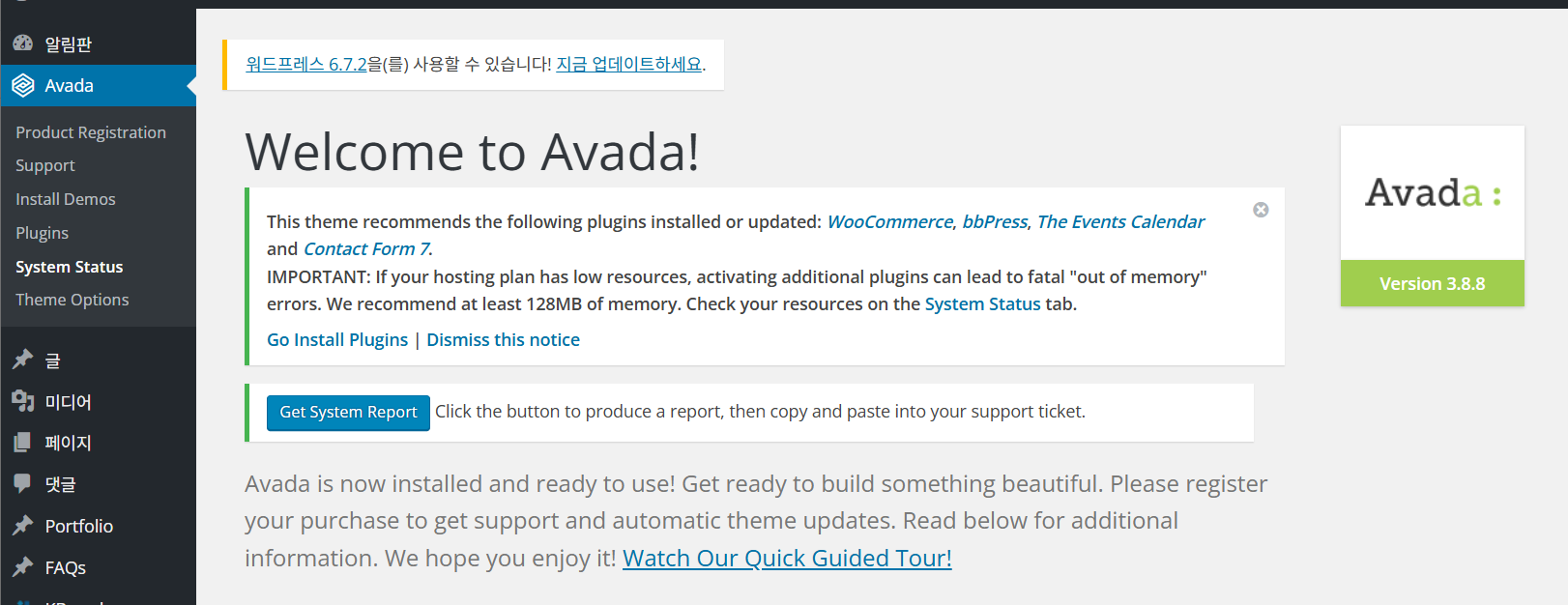 사이트에 아바다 테마가 설치된 상태였는데, 버전이 3.8.8이었습니다.