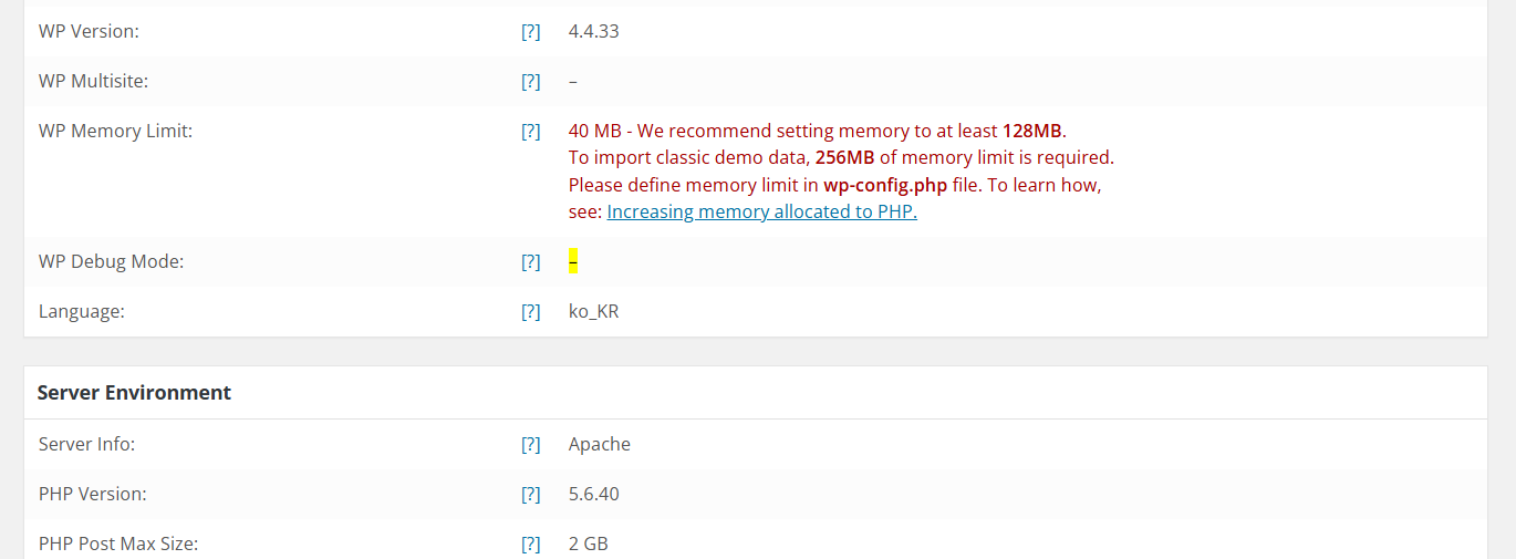 사이트를 살펴보니 워드프레스 버전이 4.4.33이었고, PHP 버전이 5.6.40으로 매우 낮았습니다.