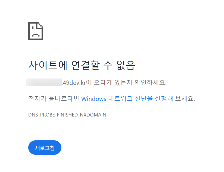 임시 도메인 주소로 접속하면 DNS_PROBE_FINISHED_NXDOMAIN 오류로 인해 접속이 불가능했습니다.