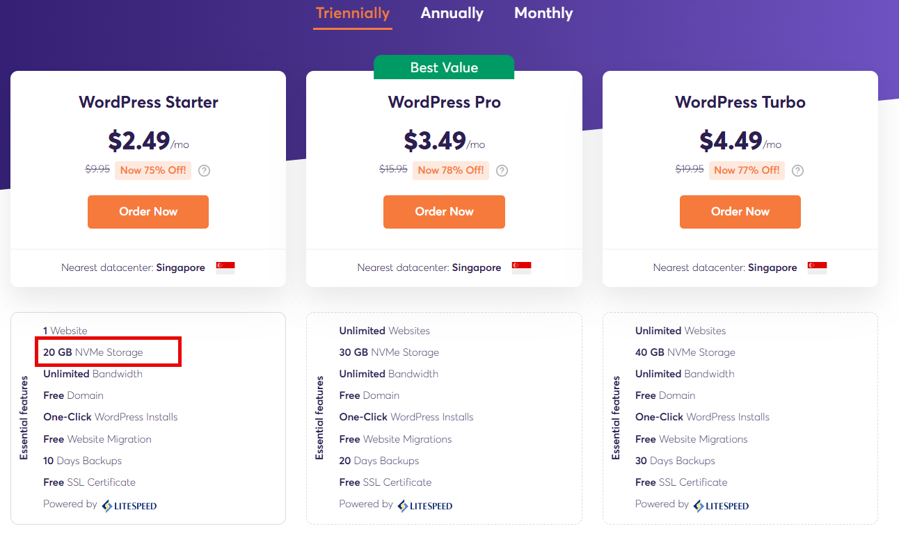 케미클라우드의 워드프레스 호스팅 중에서 가장 저렴한 WordPress Sarter의 경우 20GB의 웹용량을 제공합니다.