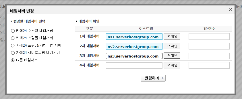 도메인은 카페24에서 등록되어 카페24에 접속하여 도메인의 네임서버를 변경했습니다.
