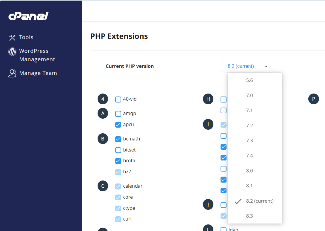 임시로 PHP 버전을 7.4로 변경한 다음, 테마와 플러그인을 업데이트한 후에 PHP 8.2로 변경했습니다. (케미클라우드에서는 현재 PHP 8.3까지 지원하고 있습니다.)