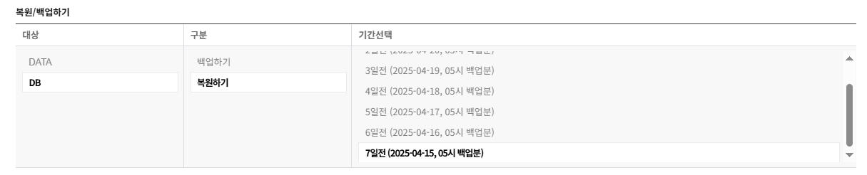 DB를 복원하려면 복원/백업하기에서 DB → 복원하기 → 날짜(1일전 ~ 7일전)를 선택합니다.