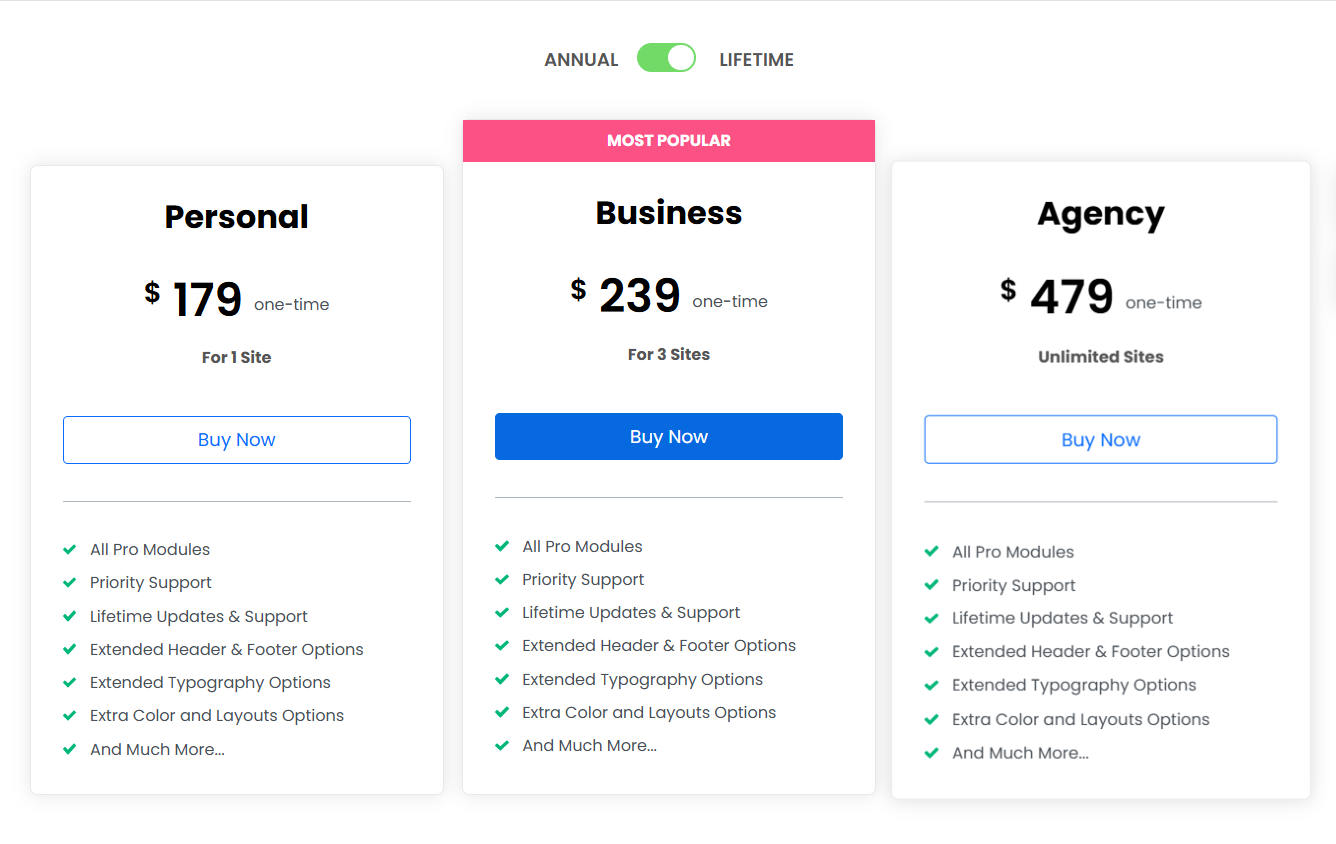 연간 구독형 라이선스의 경우 최저 59달러이고, 라이프타임(평생) 라이선스의 경우 Personal 상품이 179달러입니다. 무제한 사이트 적용할 수 있는 라이선스는 479달러입니다.