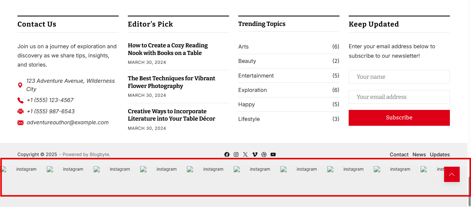Keep Updated 부분은 MailChimp를 이용한 구독 폼이 표시되어야 하는데, 구독 폼이 표시가 안 되면 삭제하고 다시 MailChimp 숏코드를 사용하여 구독 폼을 추가했습니다.