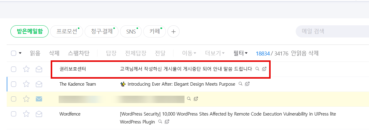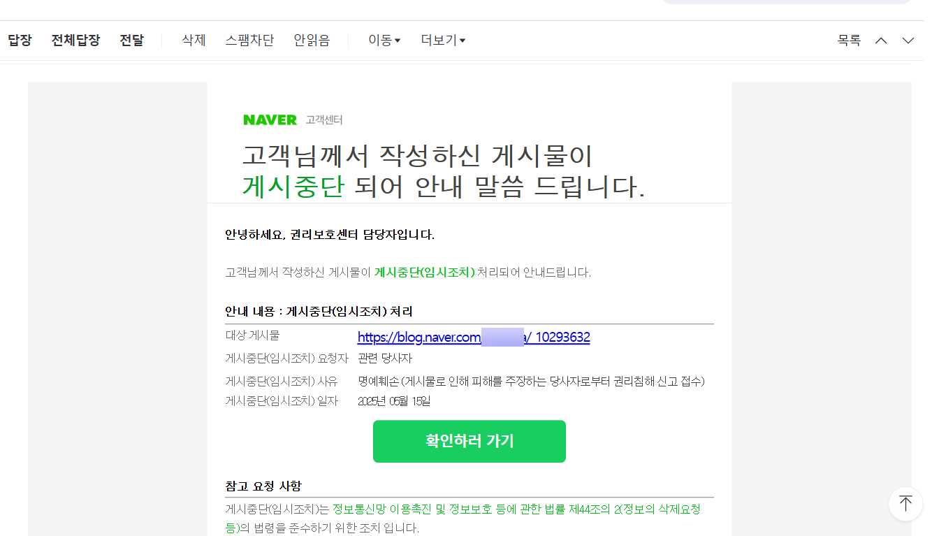 어제 네이버 권리보호센터에서 네이버 블로그의 게시굴이 게시중단되었다는 메일을 받았습니다.