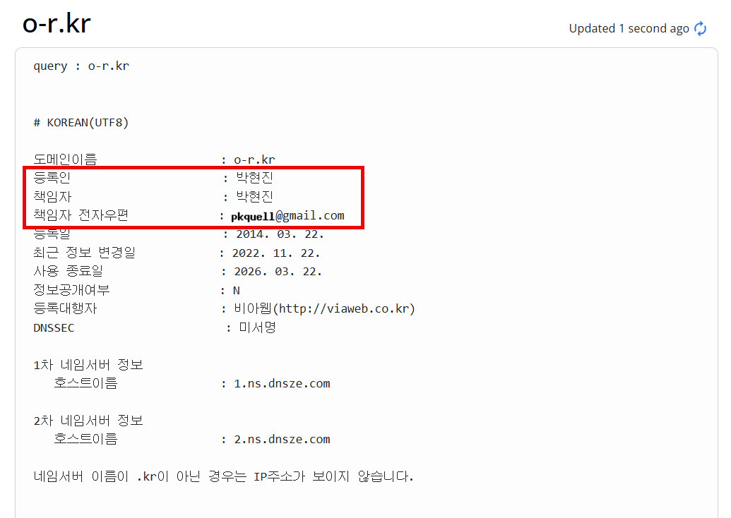 n-e.kr, r-e.kr, o-r.kr 도메인은 동일인에 의하여 동일 도메인 등록업체에 등록되어 있네요.