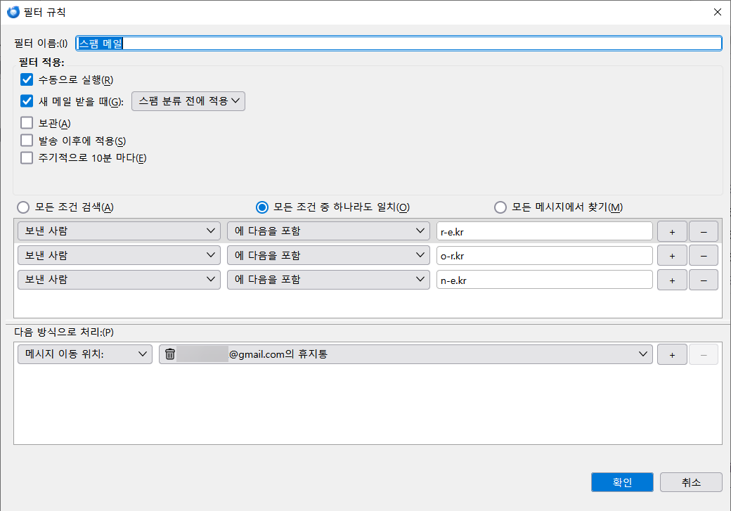지메일에 대하여도 n-e.kr, r-e.kr, o-r.kr 도메인이 포함된 이메일은 휴지통으로 이동하도록 필터링 설정을 했습니다.😊