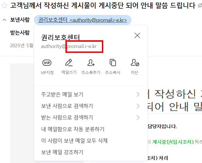 메일 발신자 주소도 확인해보니 네이버 메일 주소가 아니라 r-e.kr이라는 도메인으로 되어 있네요.