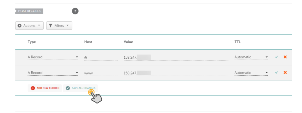그림과 같이 @ 호스트와 www 호스트에 대하여 서버 IP 주소를 설정하면 됩니다. (또는, @ 호스트 → 서버 IP 주소 (A 레코드), www 호스트 → example.com (CNAME 레코드) 형식으로 지정하는 것도 가능합니다.)