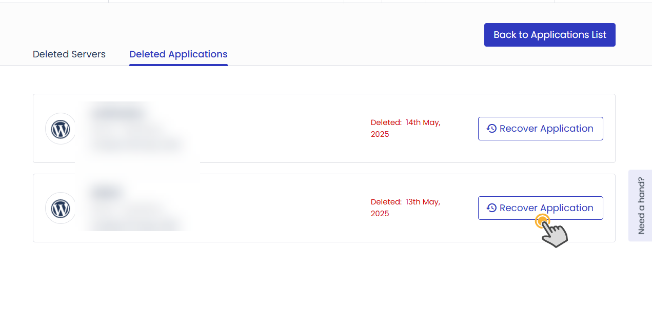 Deleted Applications 탭에 삭제된 애플리케이션들이 나열됩니다. 복구할 앱에 대하여 Recover Application 버튼을 클릭합니다.