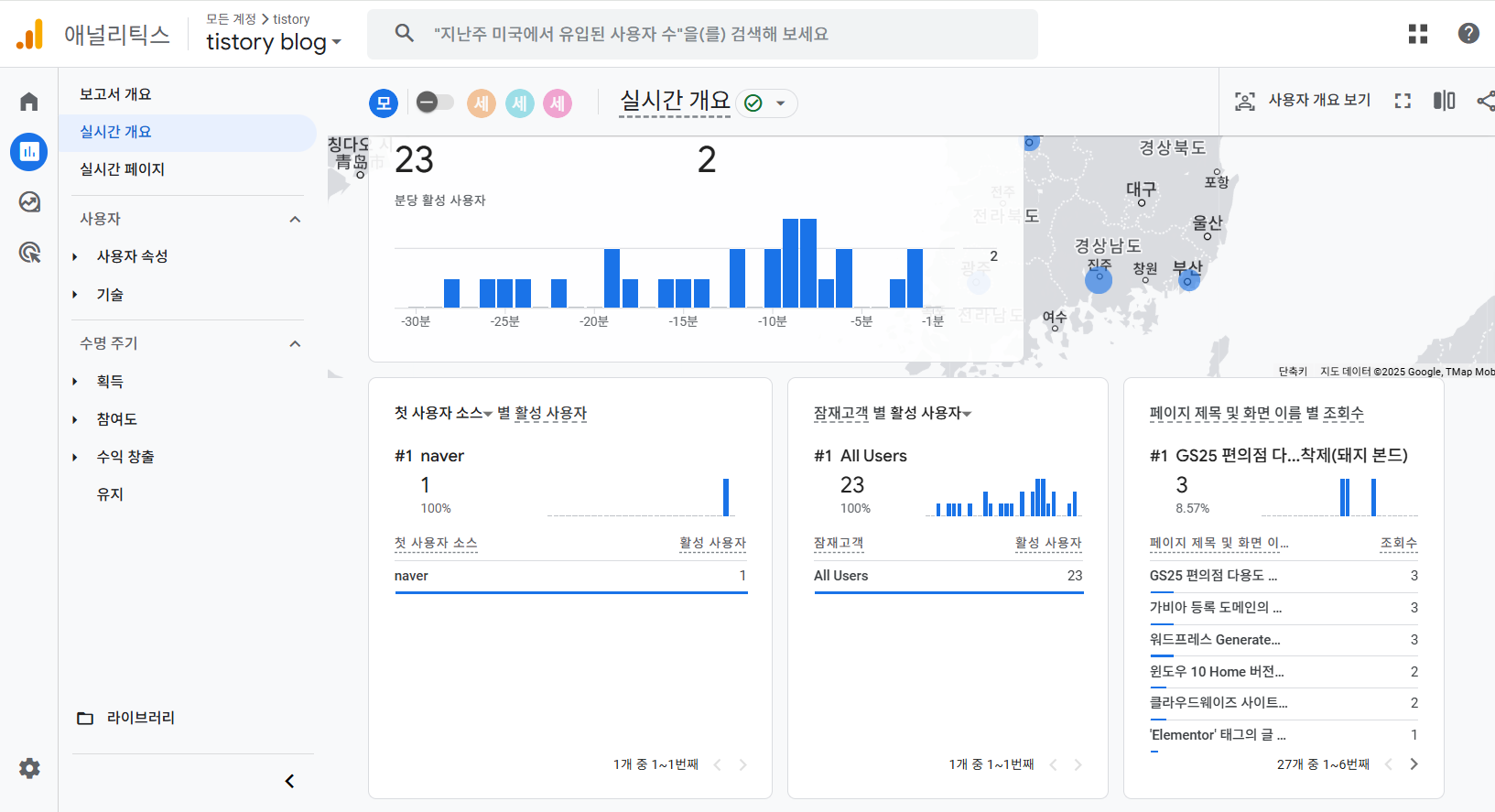 혹시 모든 검색엔진에서 이 블로그가 차단되었는지 체크해 보니 정상적으로 유입되는 것 같습니다. 다른 기기를 통해 이 블로그를 접속해도 방문자 통계에 표시되지 않고 있고, 구글 애널리틱스를 체크하니 실시간 유입에서 정상적으로 방문자 통계가 표시되고 있습니다.