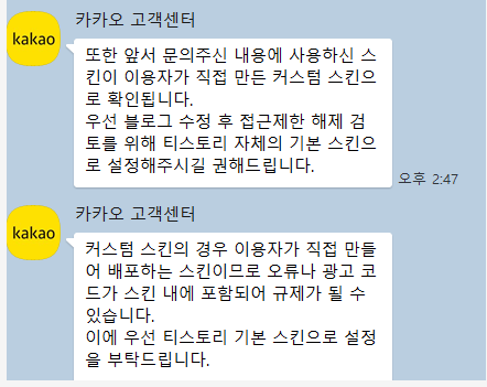 또한, 커스텀 스킨에 오류가 있거나 광고 코드가 추가되어 있는 경우에도 제재를 받을 수 있다고 카카오 고객센터에서 밝히고 있습니다.