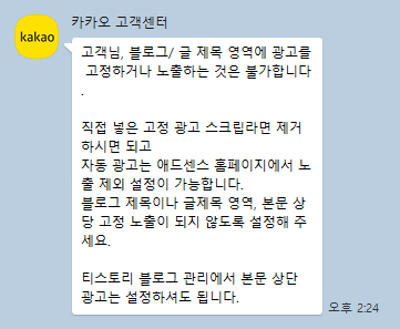 티스토리는 자체 광고 도입으로 많은 사용자들의 불만을 야기했지만, 이제는 블로그/글 제목 영역에 노출되는 광고에 대해서도 적극적으로 규제하고 있습니다.