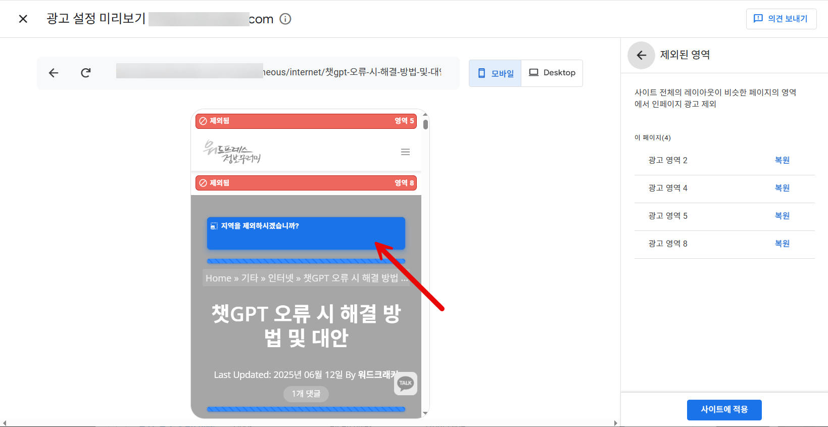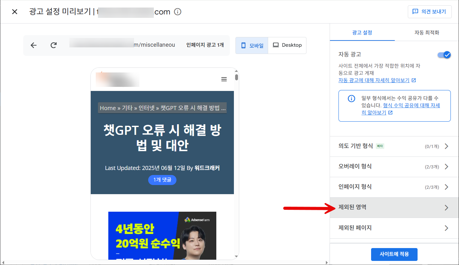 광고 설정 미리보기 화면이 나오면 광고 설정 » 제외된 영역을 클릭합니다.