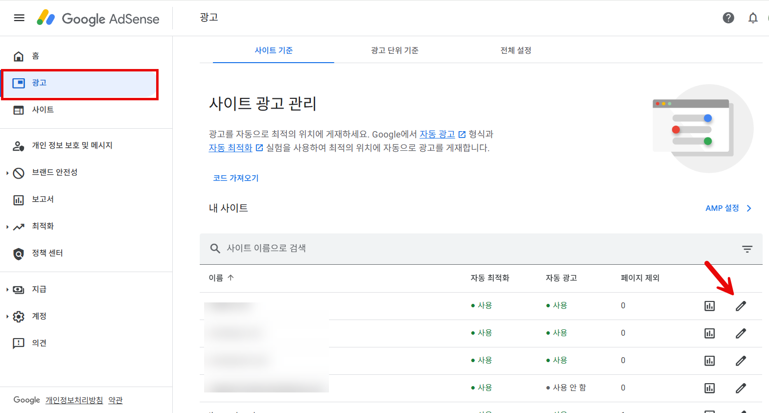 특정 영역에 대한 자동 광고를 제외시키려는 경우 애드센스 계정에 로그인한 다음, 왼쪽의 광고를 클릭하고 수정하려는 사이트의 맨 오른쪽에 있는 수정 아이콘을 클릭합니다.