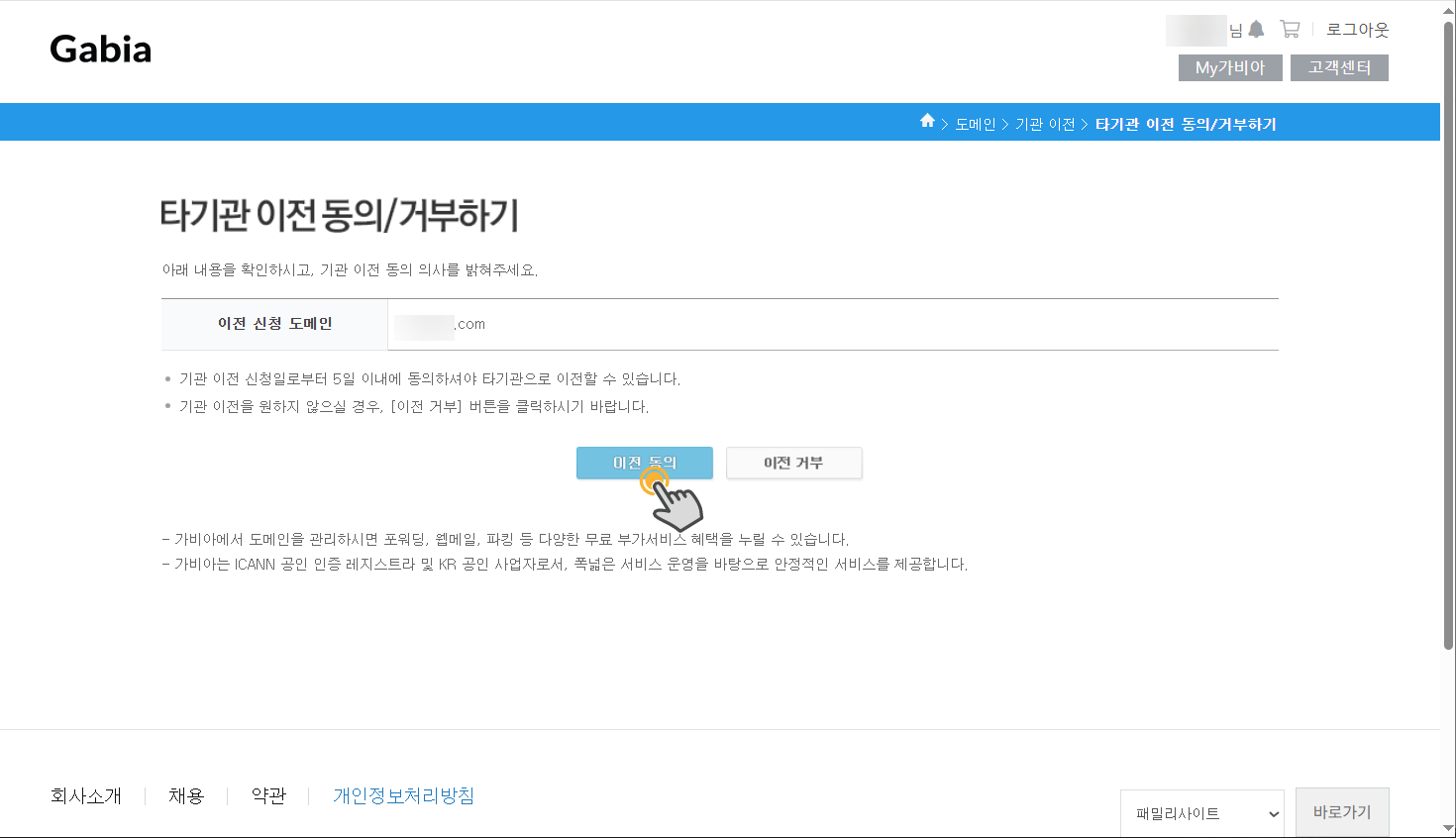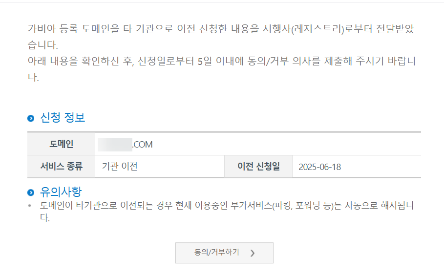 현재 도메인 등록업체(가비아)에서 기관이전 신청 승인