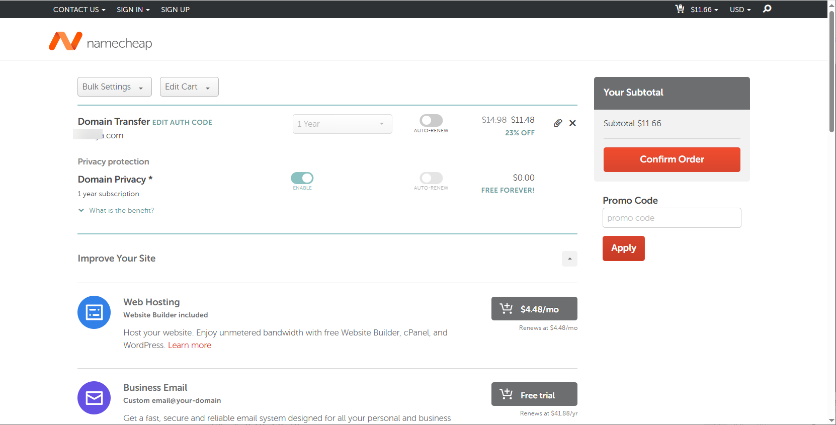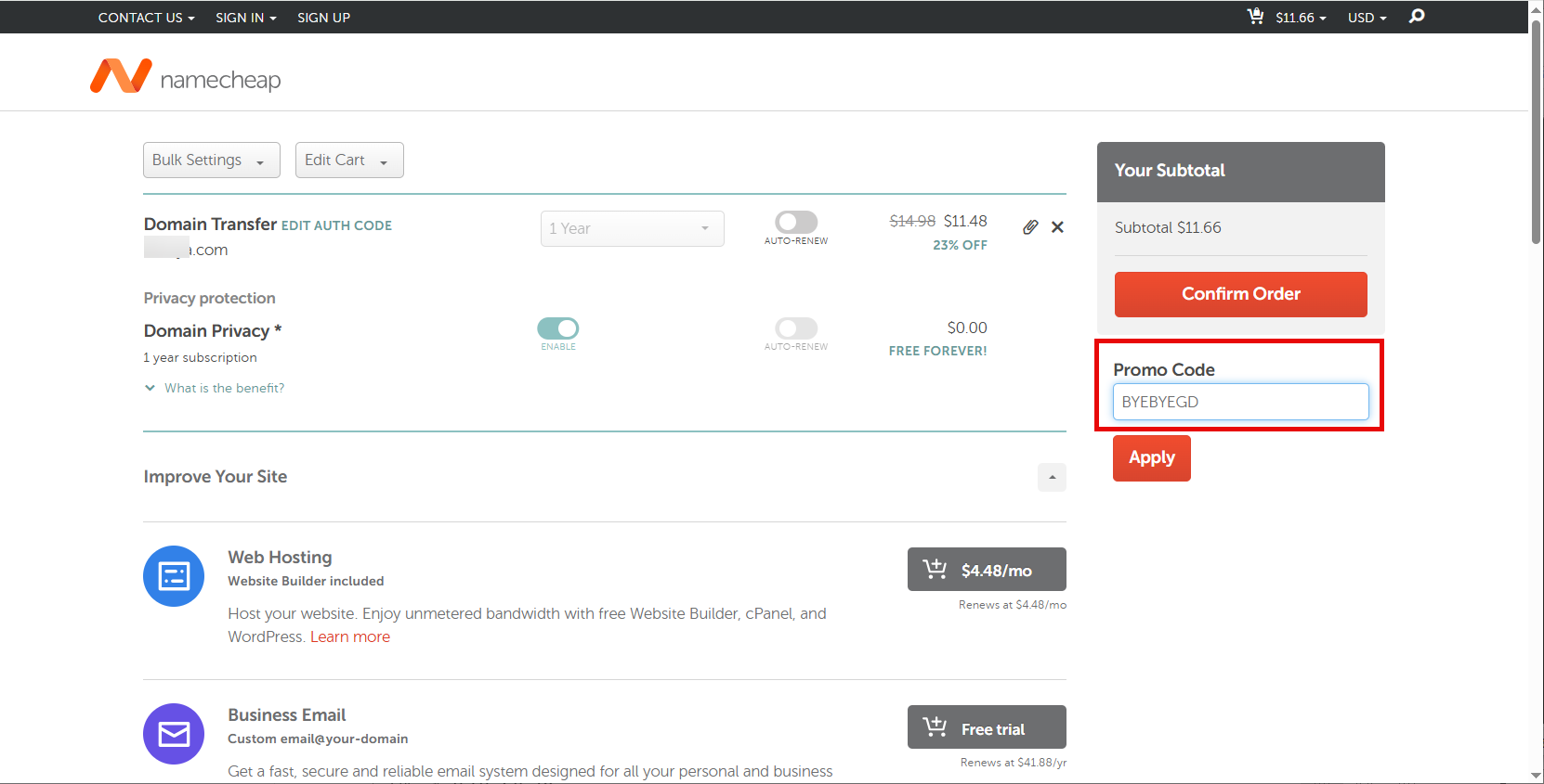 위와 같은 화면이 표시되면 Promo Code에 다음과 같은 코드를 입력하여 작동하는지 확인해보시기 바랍니다. 작동하지 않으면 Domain Transfer 페이지에 프로모 코드가 있는지 체크해 보시기 바랍니다. (경우에 따라 사용 가능한 프로모 코드가 없을 수도 있습니다.)