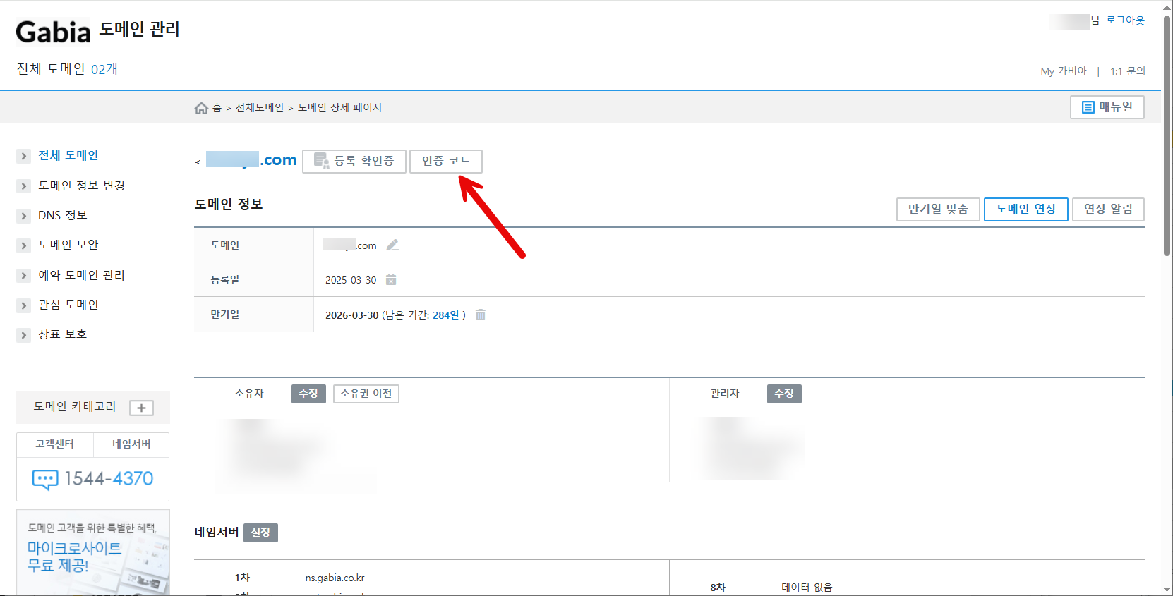 전체 도메인에서 도메인을 클릭한 다음, 인증 코드 버튼을 클릭합니다.
