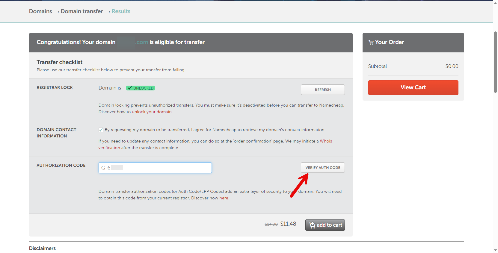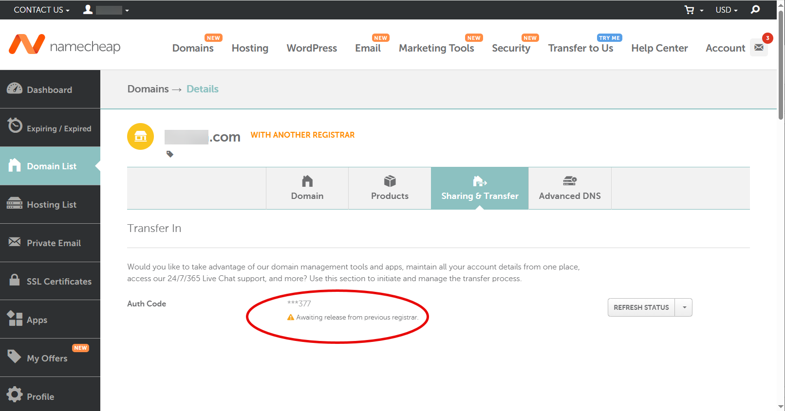 인증코드를 발급받았으므로 이제 Namecheap에서 기관이전 신청을 할 수 있습니다.