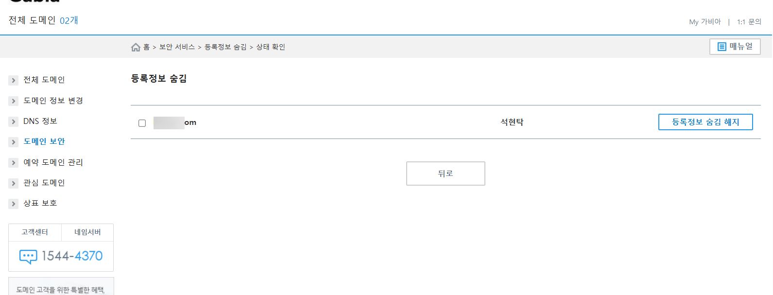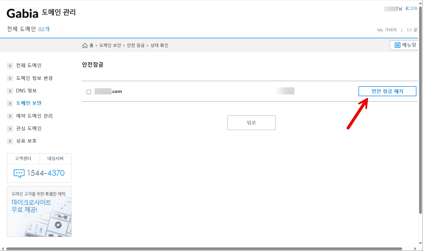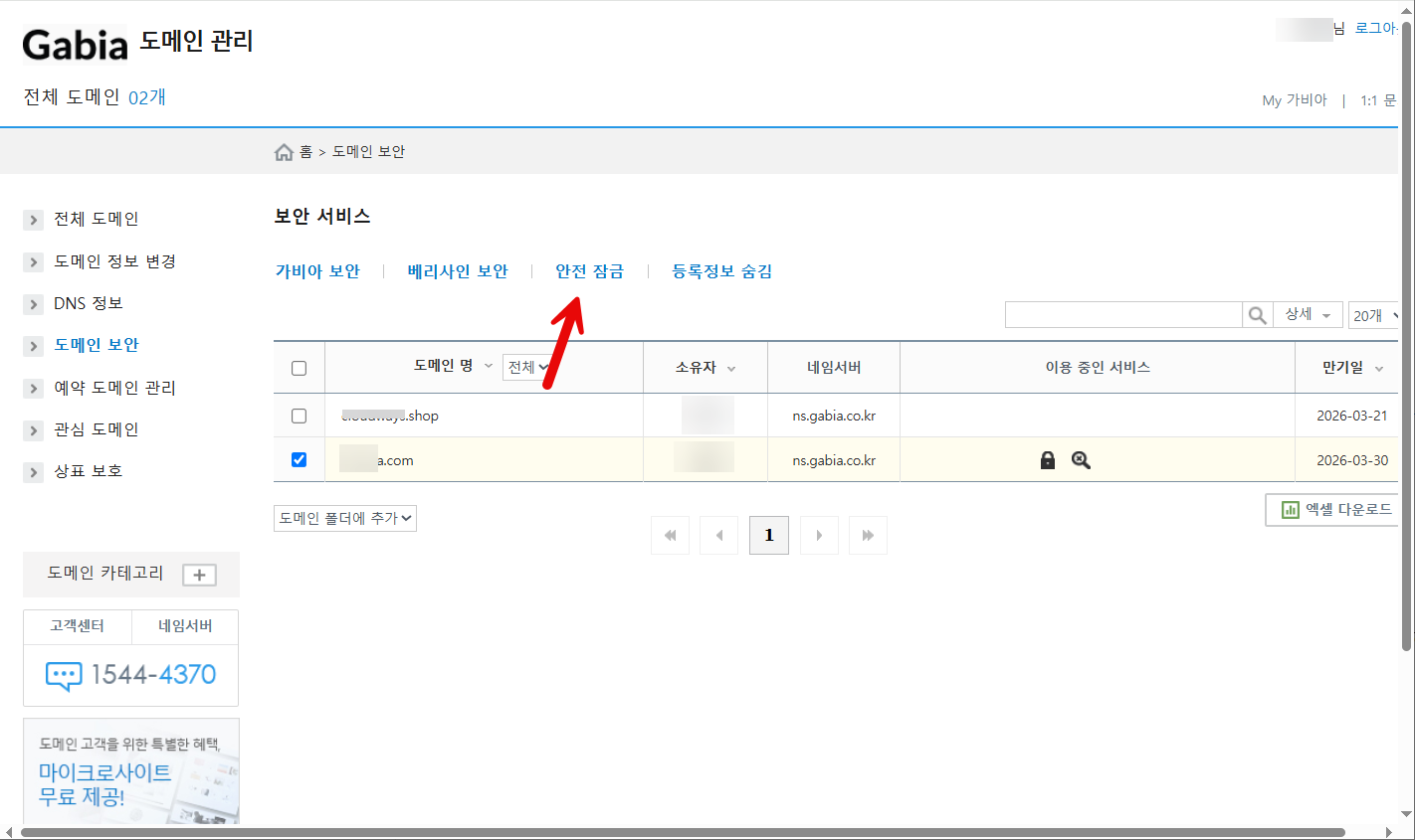 먼저 가비아에 로그인하여 안전 잠금과 등록정보 숨김 서비스를 해지해야 합니다.
