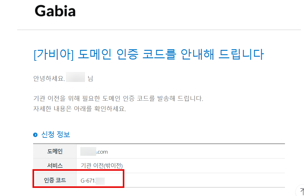 이제 인증코드를 받아서 도메인 기관이전 신청을 할 수 있습니다.