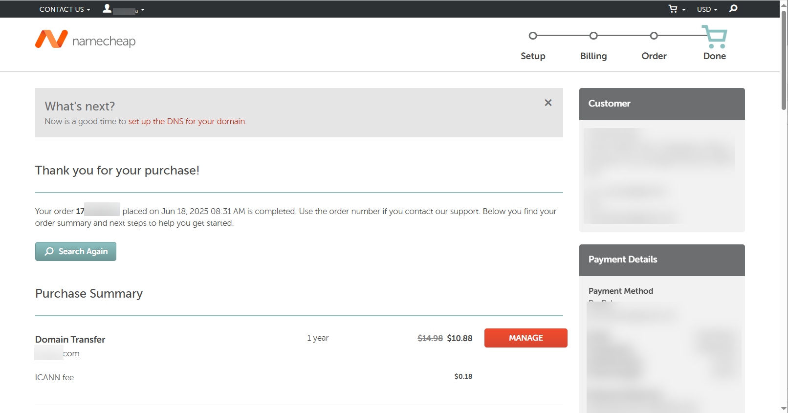 2. 새로운 도메인 등록업체(예: Namecheap)에서 1년간 연장(결제)하면서 기관이전을 요청합니다.