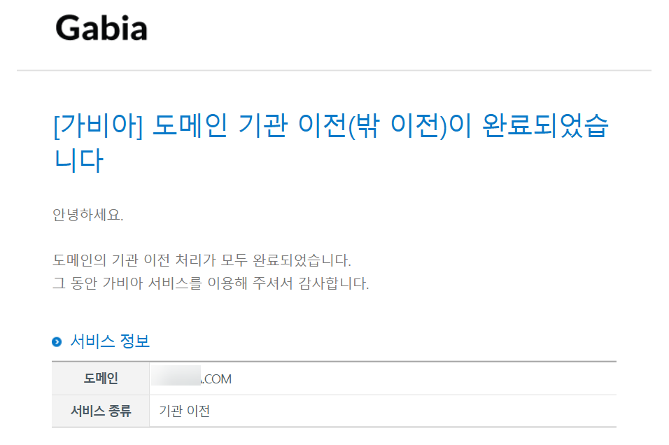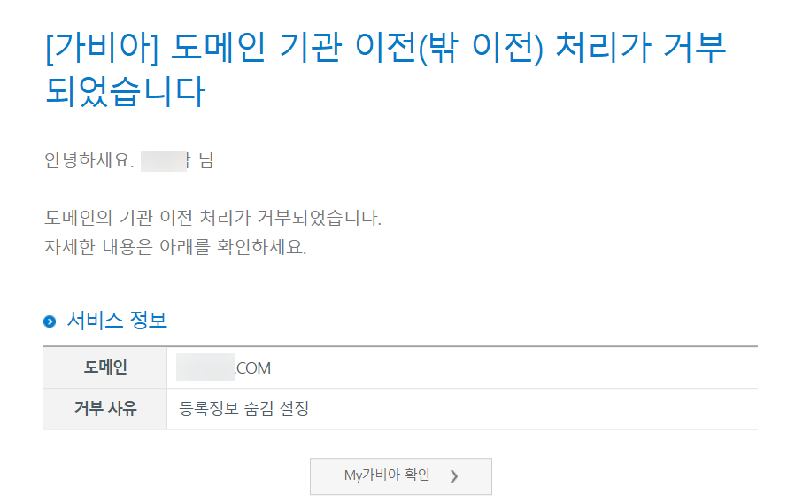 저는 도메인 숨김 설정을 해지하지 않아서 이전 동의 메일 대신 가비아에서 "도메인 기관 이전(밖 이전) 처리가 거부되었습니다" 메일을 보내왔습니다.