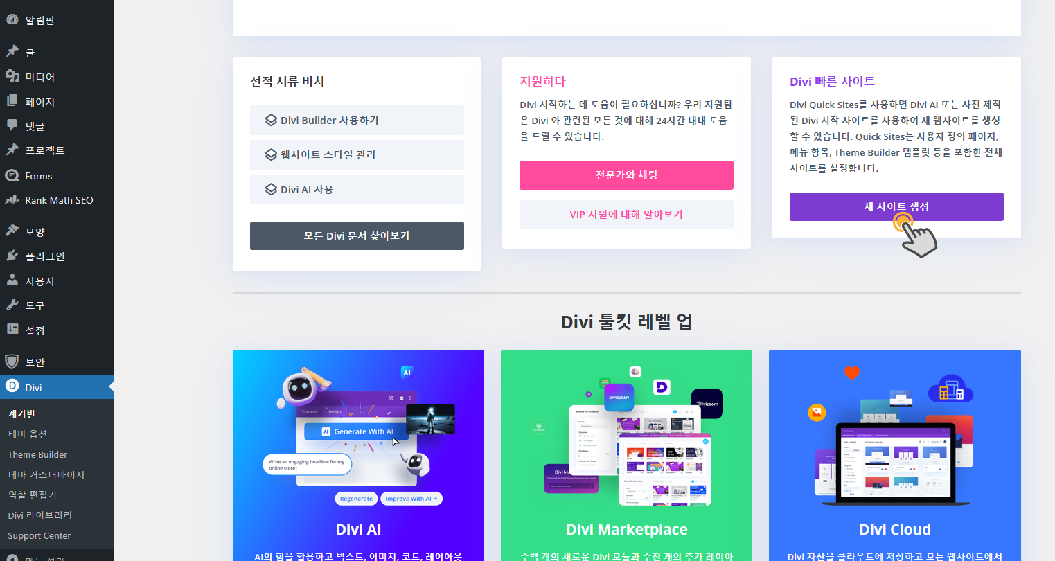Divi 대시보드의 'Quick Sites' 메뉴에서 "Generate A New Site"를 클릭 후, 템플릿을 선택하면 사이트가 자동 생성됩니다. 한글 버전에서는 아래와 같이 Divi » 계기반 » Divi 빠른 사이트의 "새 사이트 생성"을 클릭합니다. (계기반은 "대시보드"의 번역인데, 번역이 부자연스럽습니다. 한글 번역을 비활성화할 수 있습니다.)