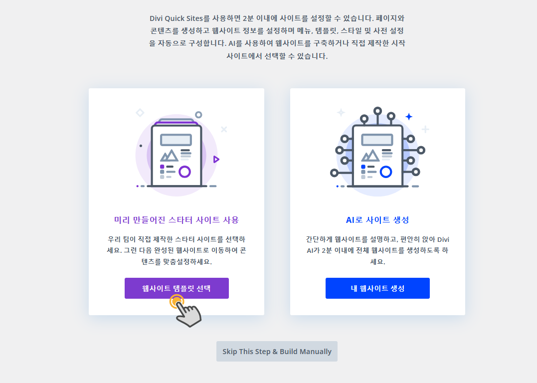 미리 만들어진 스타터 사이트 사용의 "웹사이트 템플릿 선택" 버튼을 선택합니다. Divi AI에 가입한 경우 AI로 사이트 생성의 "내 웹사이트 생성" 버튼을 클릭하여 인공지능으로 템플릿을 만드는 것도 가능합니다.