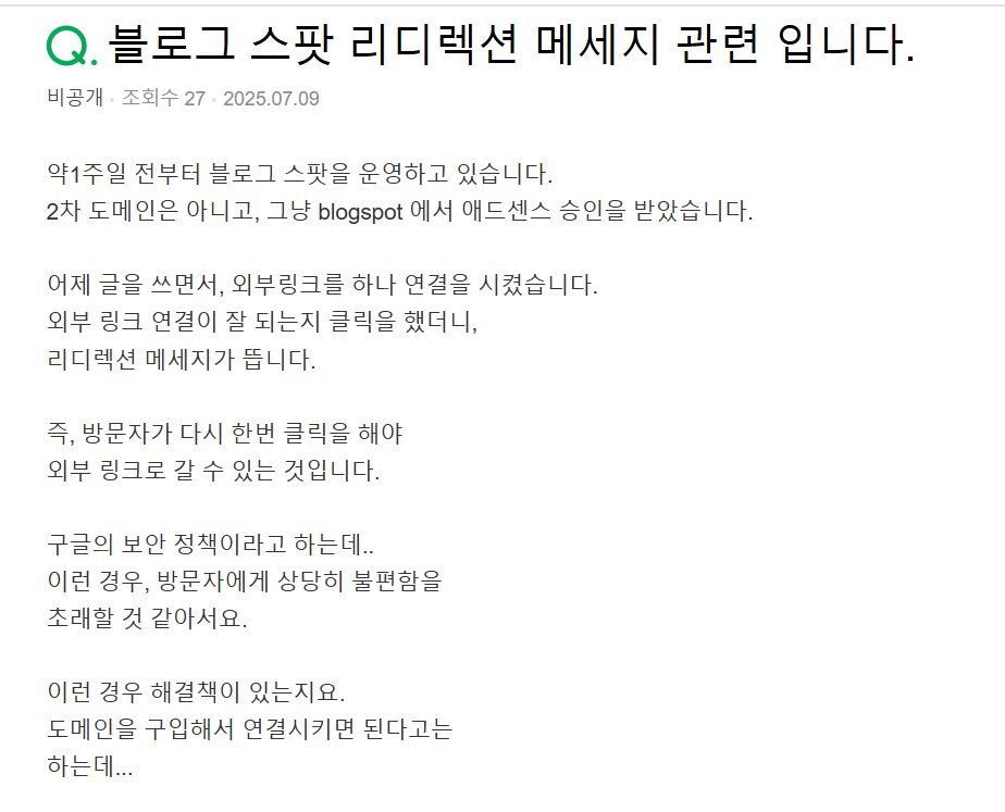 네이버 카페에 블로그스팟 리디렉션 메시지 관련 질문이 올라와서 이 문제에 대하여 잠시 살펴보았습니다.