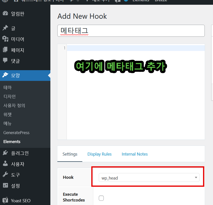 Hook에서 wp_head를 선택하면 <head>...</head> 섹션에 코드가 삽입됩니다.