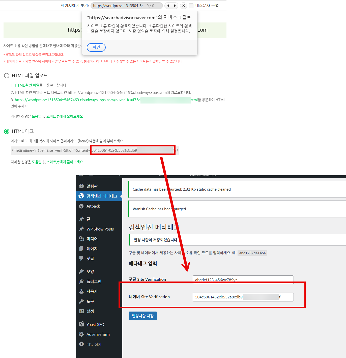 워드프레스용 구글 및 네이버 사이트 소유 확인 메타태그 관리자 플러그인