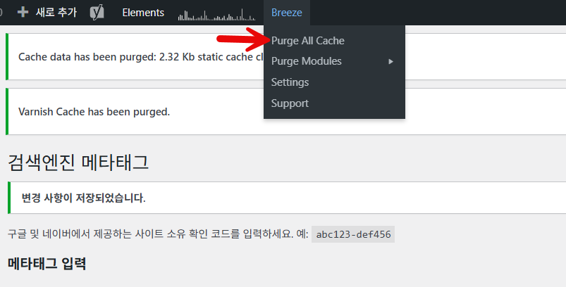 사이트 소유 확인에 실패한다면 캐시 플러그인의 캐시를 삭제하시기 바랍니다. 예를 들어, 클라우드웨이즈(Cloudways)의 Breeze 캐시 플러그인을 사용한다면 상단 툴바의 Breeze » Purge All Cache를 눌러 모든 캐시를 삭제할 수 있습니다.