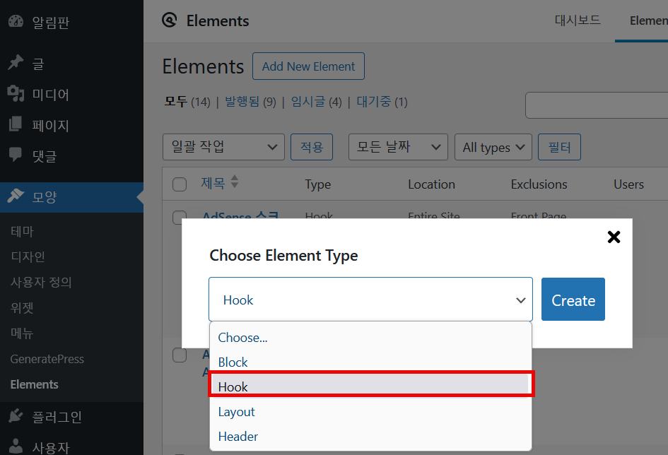 GeneratePress 테마를 사용한다면 모양 » Elements에서 Add New Element 버튼을 클릭하여 훅(Hook)을 생성하여 헤더 섹션에 코드를 추가할 수 있습니다.