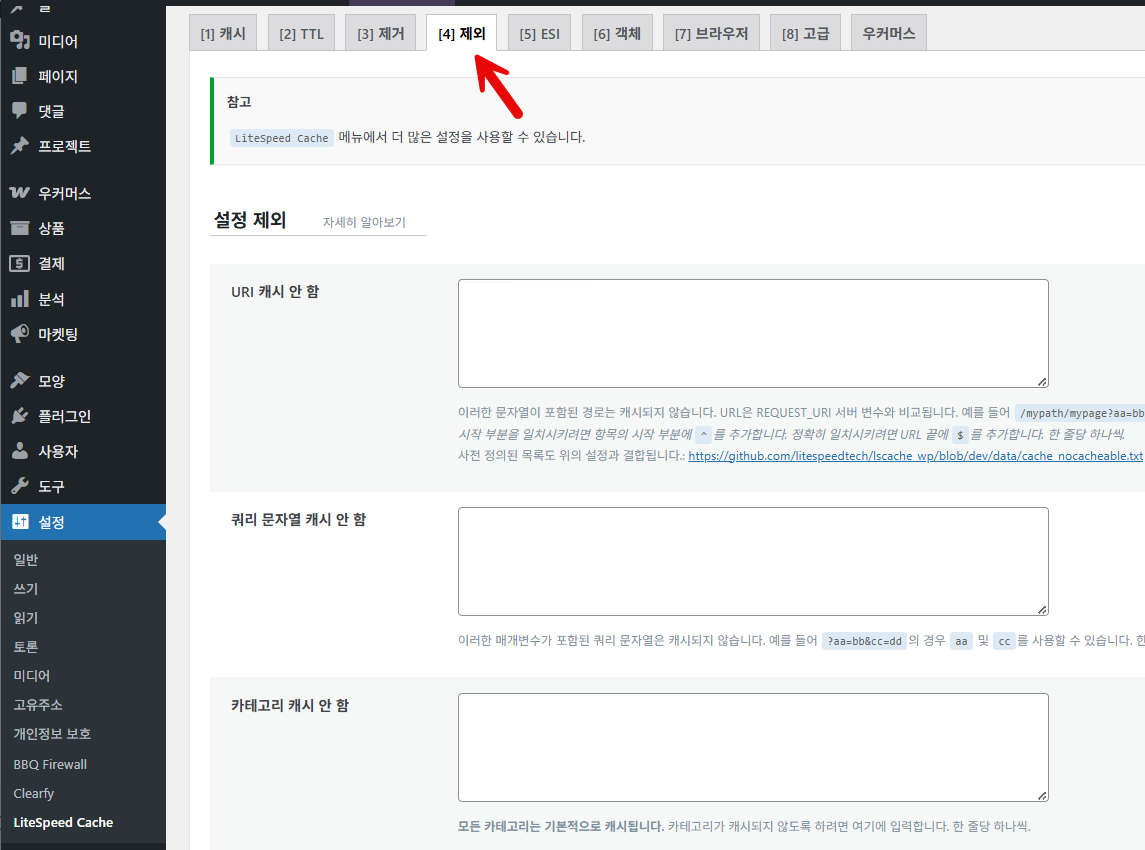 케미클라우드에서는 LiteSpeed Cache 플러그인을 권장하고 있습니다. 이 플러그인이 설치된 경우 설정 » LiteSpeed Cache » [4] 제외 탭에서 캐싱 제외 설정을 할 수 있습니다.