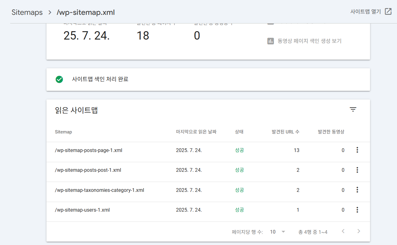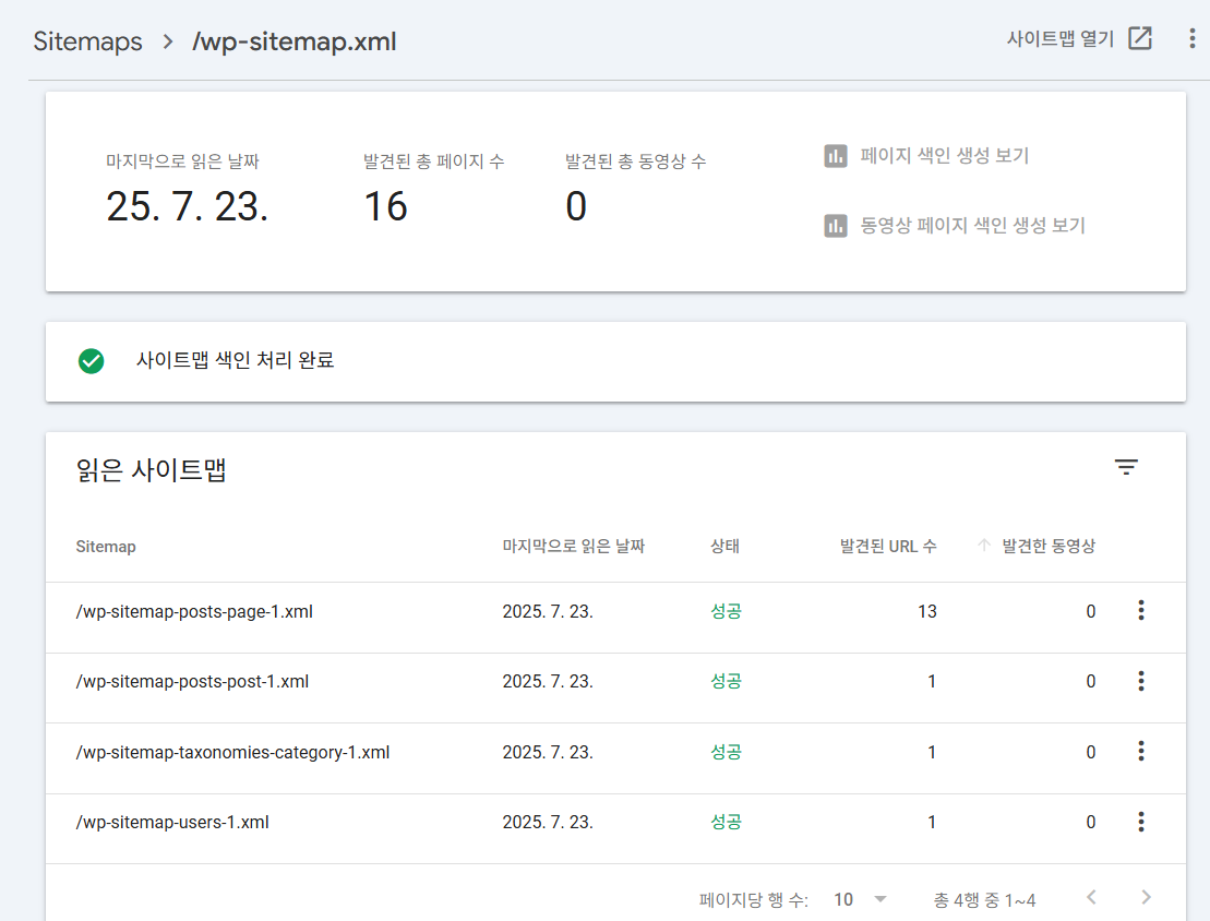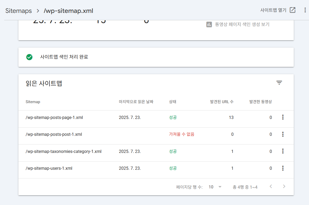 위의 그림과 같이 사이트맵 상태가 '성공'으로 표시되어야 합니다. 그리고 사이트맵을 클릭했을 때, 하위 사이트맵(예: wp-sitemap-posts-post-1.xml)의 상태도 '성공'으로 표시되어야 합니다.