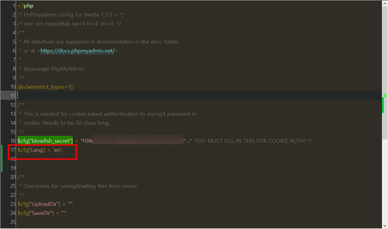 아래 그림과 같이 $cfg["blowfish_secret"] 라인 아래에 추가할 수 있습니다.