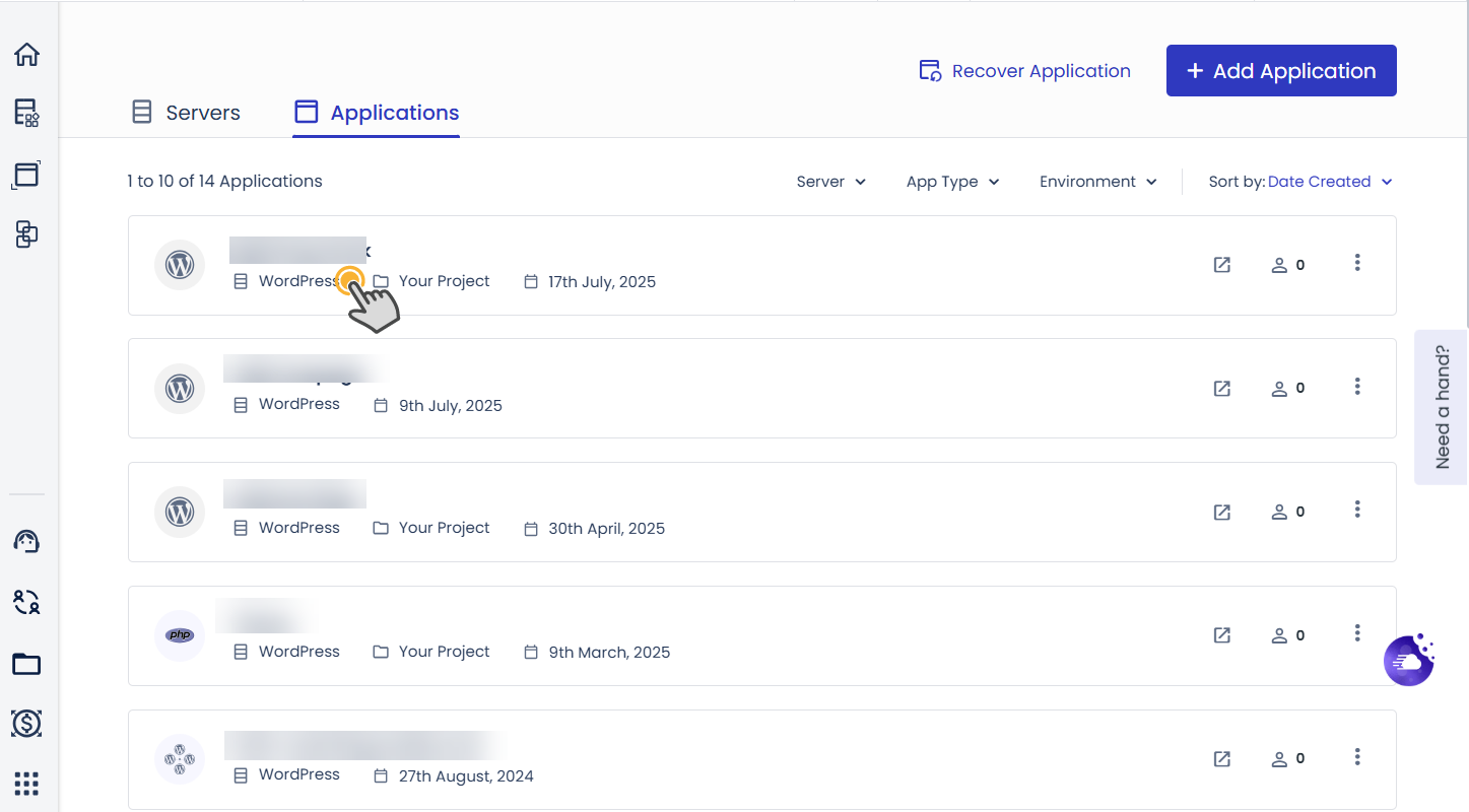 1. 클라우드웨이즈에 로그인한 후에 Applications 탭을 눌러 애플리케이션(워드프레스) 목록을 표시하고, 퍼미션을 조정할 애플리케이션을 선택합니다.