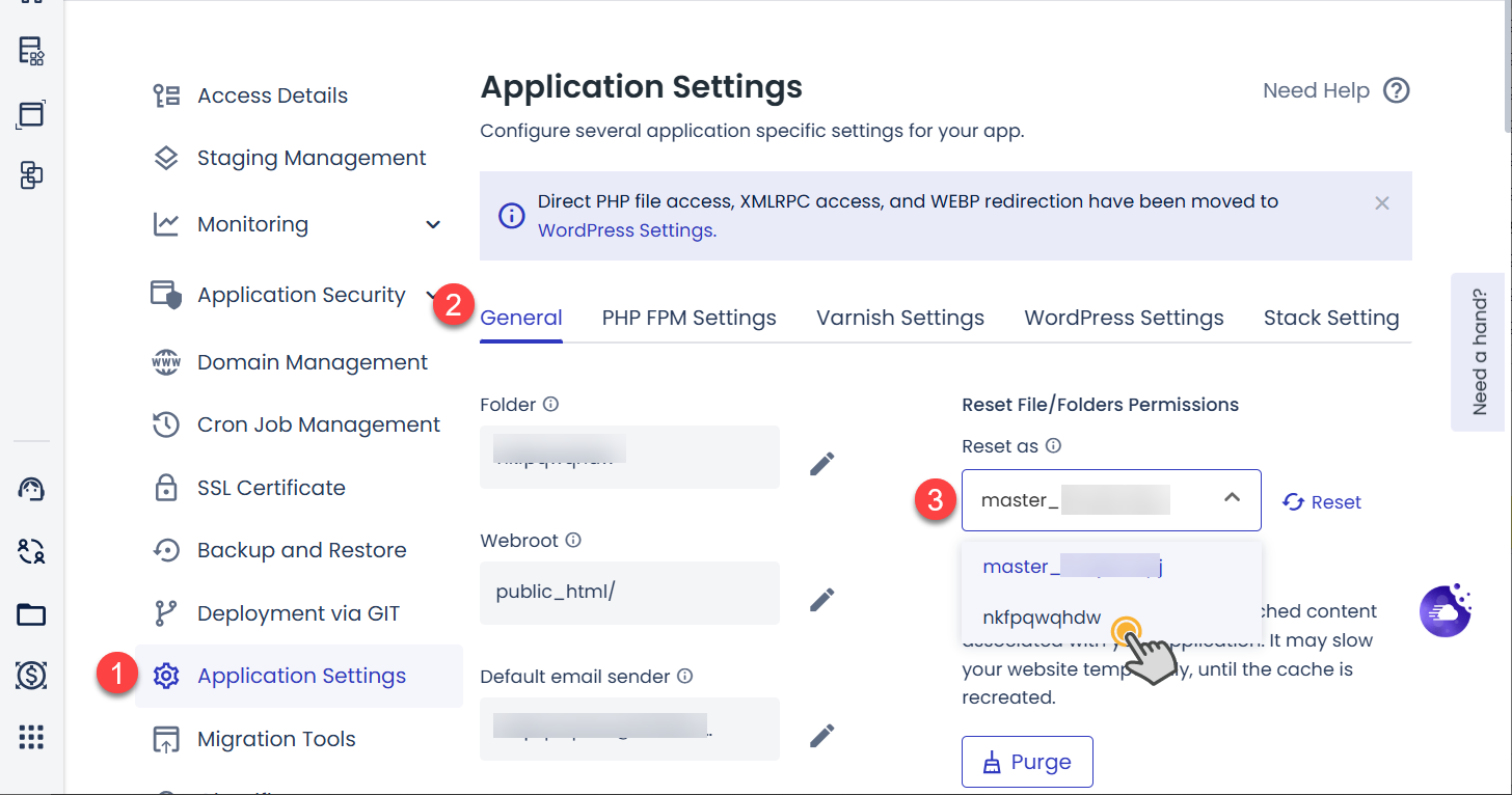 2. 애플리케이션 관리 페이지가 표시되면 왼쪽의 Applications Settings(①)를 클릭하고 General 탭(②)을 선택합니다. Reset File/Folders Permissions에서 Reset as 드롭다운(③)을 클릭하고 master_로 시작하는 마스터 사용자가 아닌 애플리케이션 사용자를 선택합니다.
