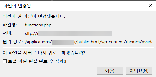 오류:	/applications/예시계정ID/public_html/wp-content/themes/Avada/functions.php: open for write: permission denied