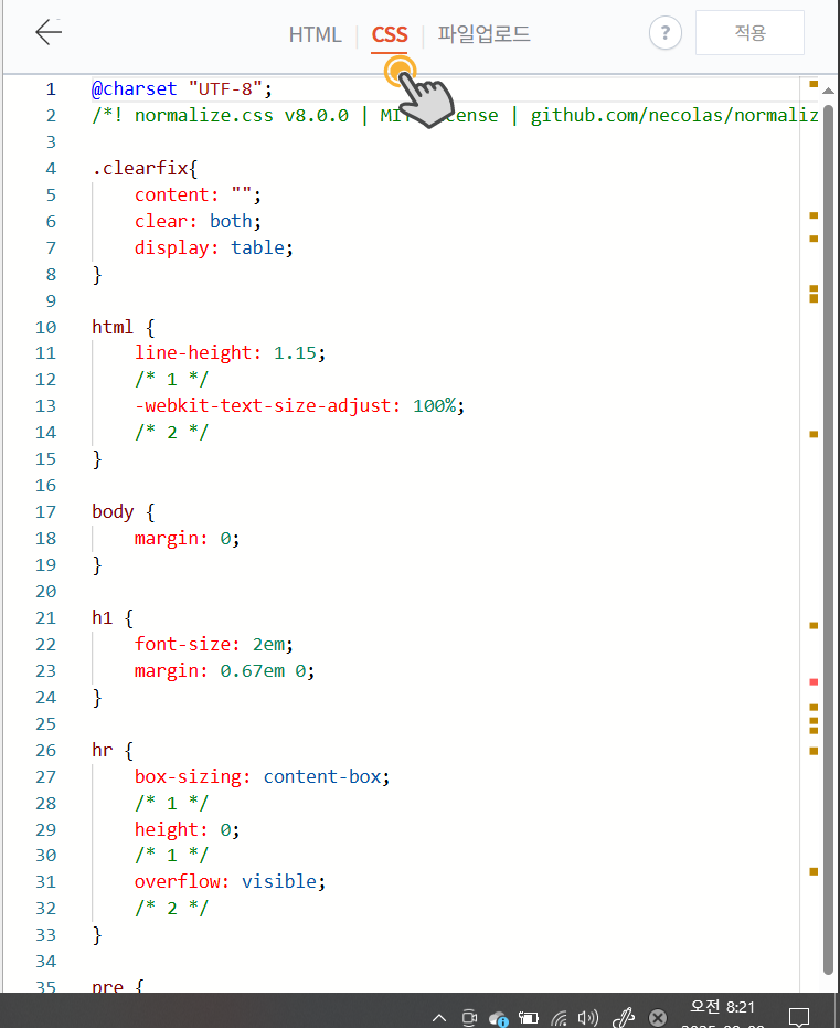 ④ 맨 하단으로 스크롤하여 상기에 제시된 CSS 코드를 추가하거나 직접 만든 코드를 추가합니다.