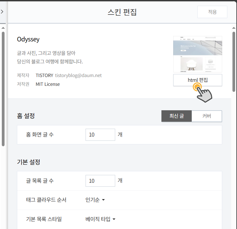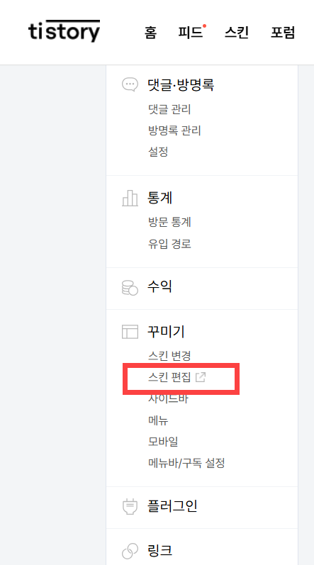 ① 꾸미기 » 스킨 편집을 클릭합니다.