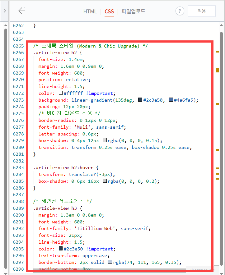 상기에 사용된 코드에서 article-view를 entry-content로 바꾸면 북클럽 스킨의 소제목 스타일을 바꿀 수 있습니다.