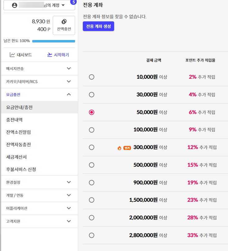 CoolSMS는 야놀자, 토스, 메리츠 등의 업체에서도 이용하는 서비스 발송 서비스이며 요금은 최소 1만 원부터 충전이 가능하며, 280만 원 이상 충전 시 33% 추가 적립이 제공됩니다.😄