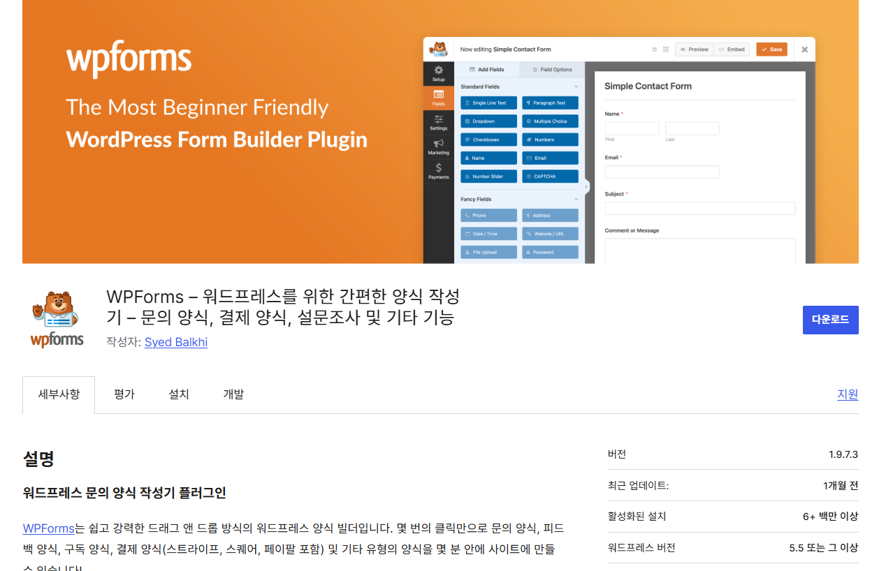 WPForms는 현재 600만 개가 넘는 사이트에 설치되어 사용되고 있는 인기 워드프레스 컨택트 폼 플러그인입니다. (WPForms는 무료 버전과 유료 버전이 있습니다.)