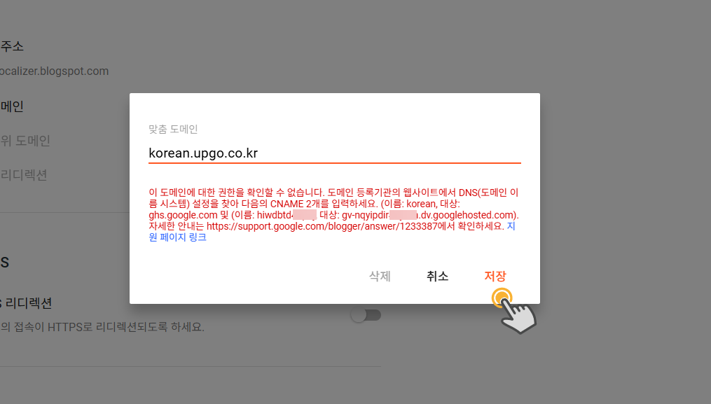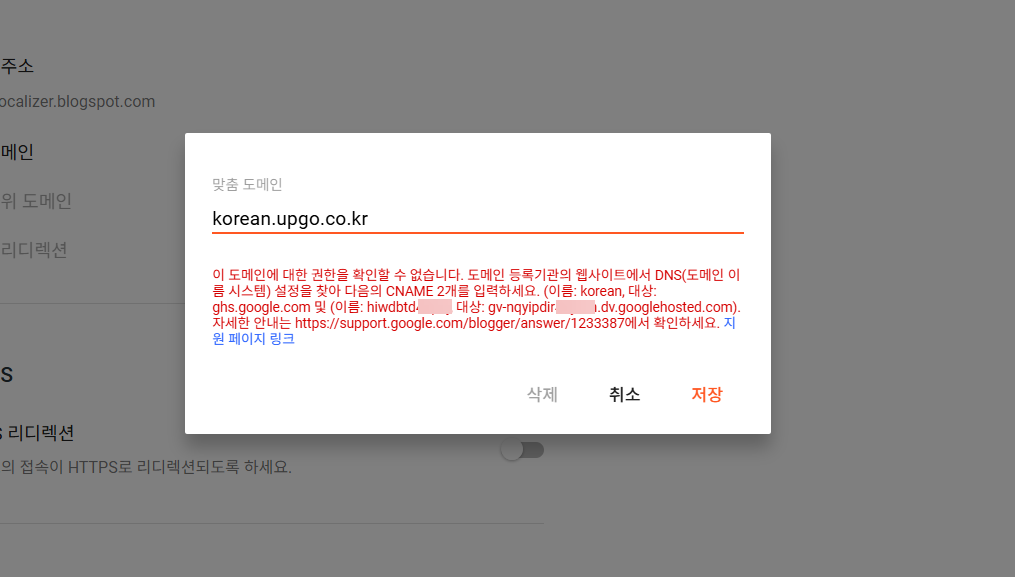 [참고*만약 기본 도메인(example.com 형식)을 블로그스팟에 연결하면서 이미 gv-...div.googlehosted.com 레코드를 추가한 경우에는 상기 경고가 표시되지 않을 것입니다. 그러면 서브도메인 호스트만 설정하면 됩니다. 블로그스팟 맞춤 도메인 추가 시 DNS 레코드 설정 팝업이 표시되지 않는 경우 글을 참고해보세요.*]