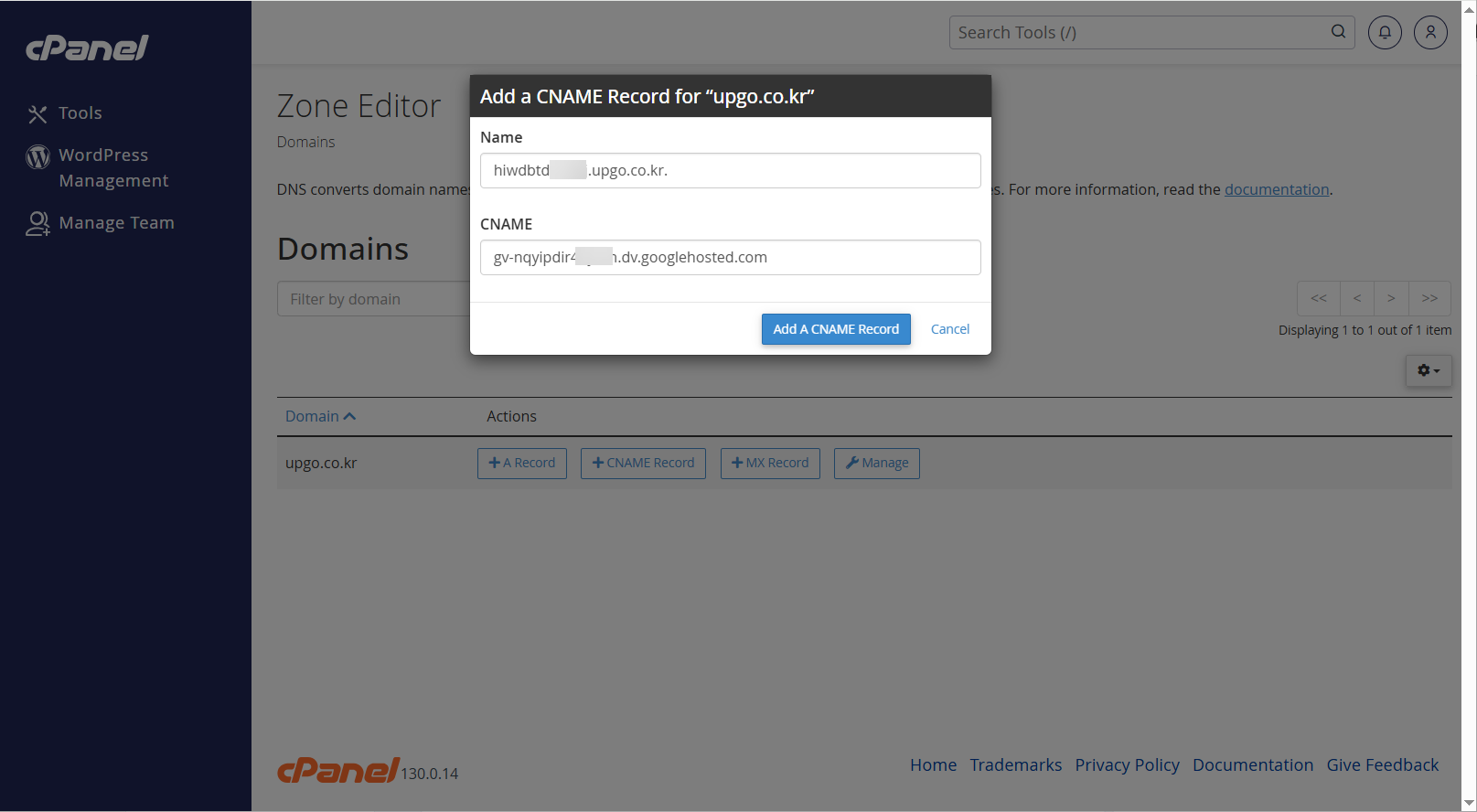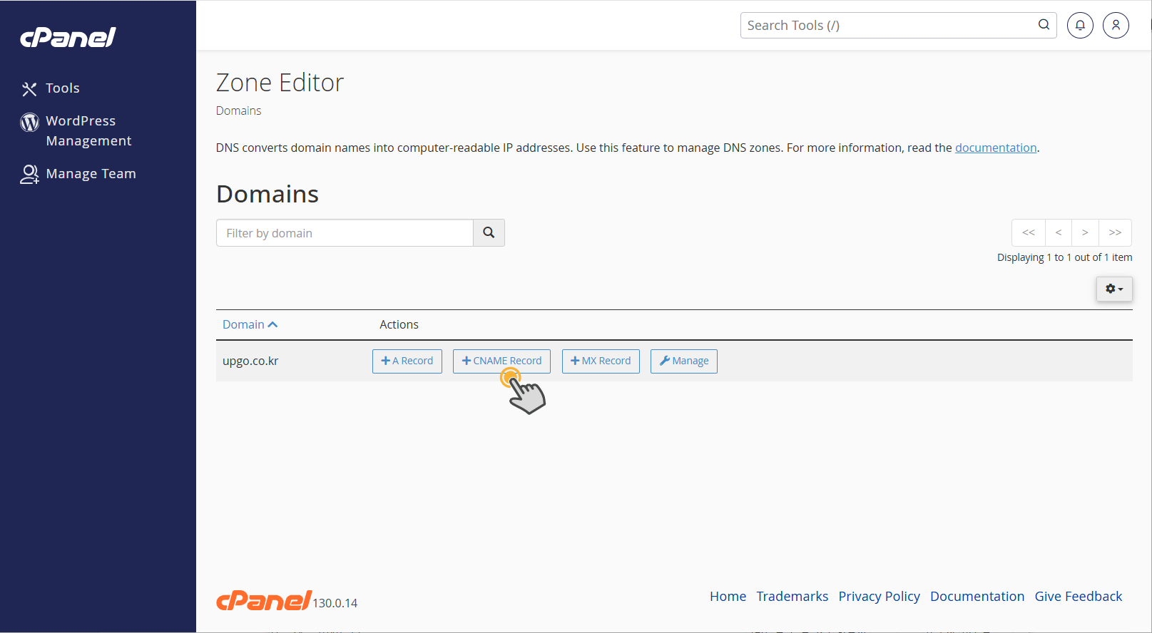 케미클라우드의 경우 cPanel에 로그인하여 Zone Editor에서 CNAME 레코드를 설정할 수 있습니다.